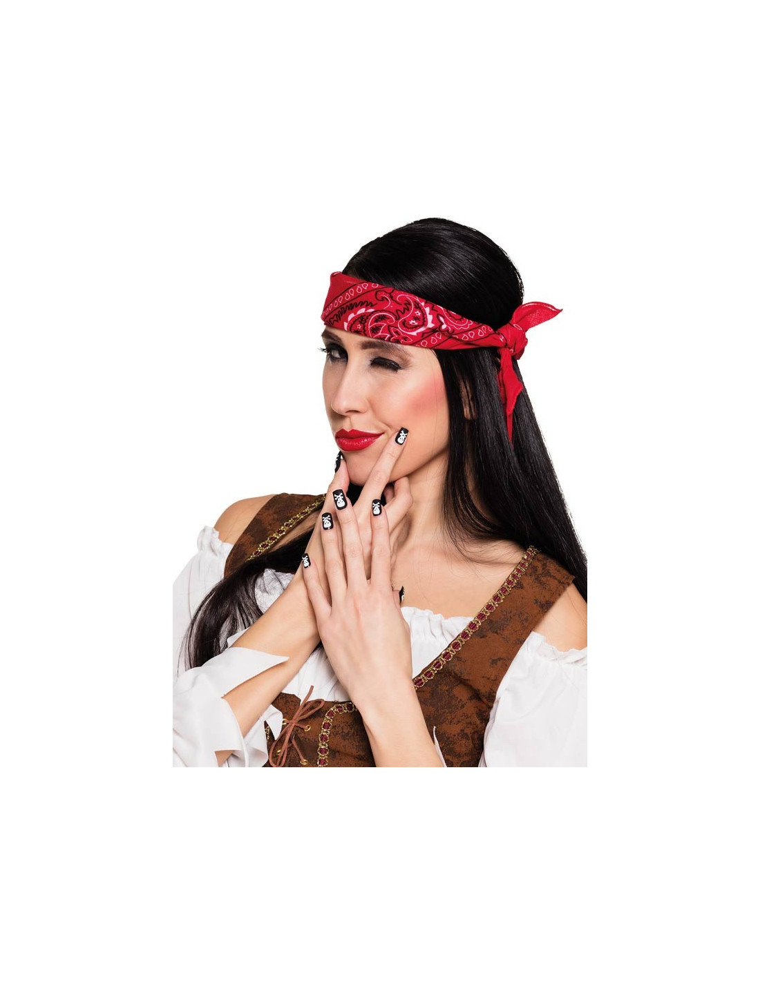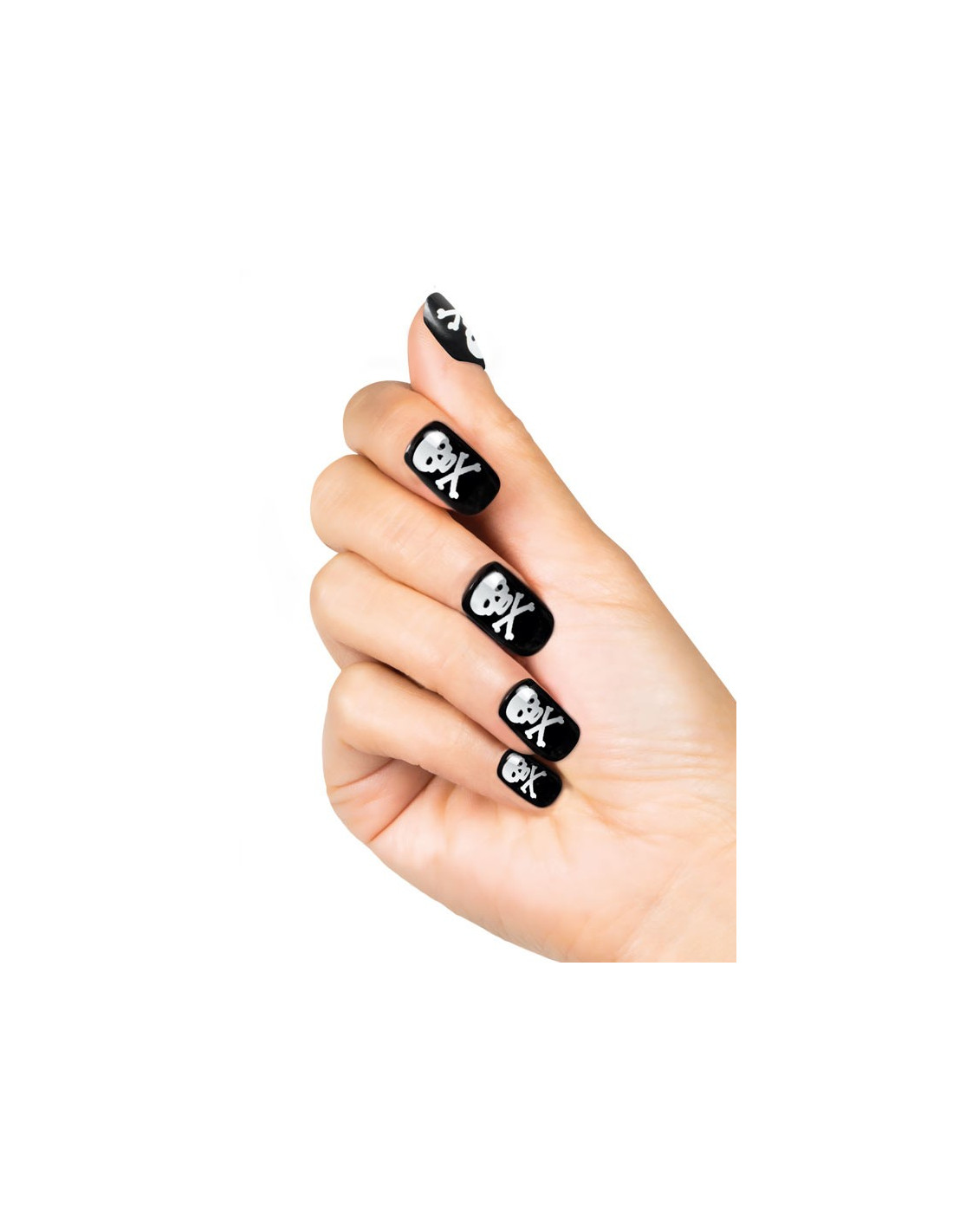 Uñas calaveras piratas que incluye 24 uñas postizas negras con calaveras blancas y 24 adhesivos a doble cara.