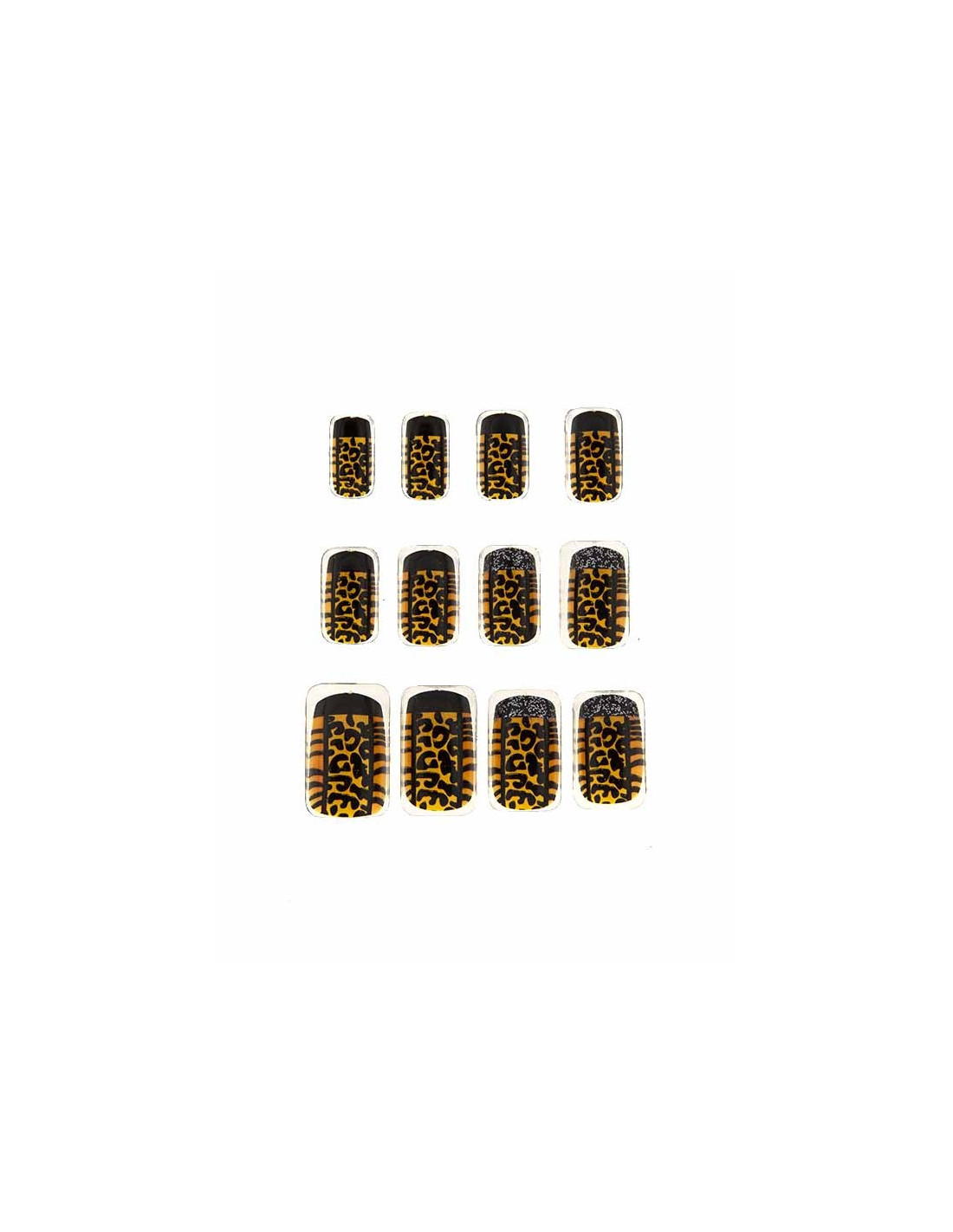Uñas postizas tigresa que consta de un pack de 10 uñas postizas con estampado de tigresa y pegatinas para colocarlas.