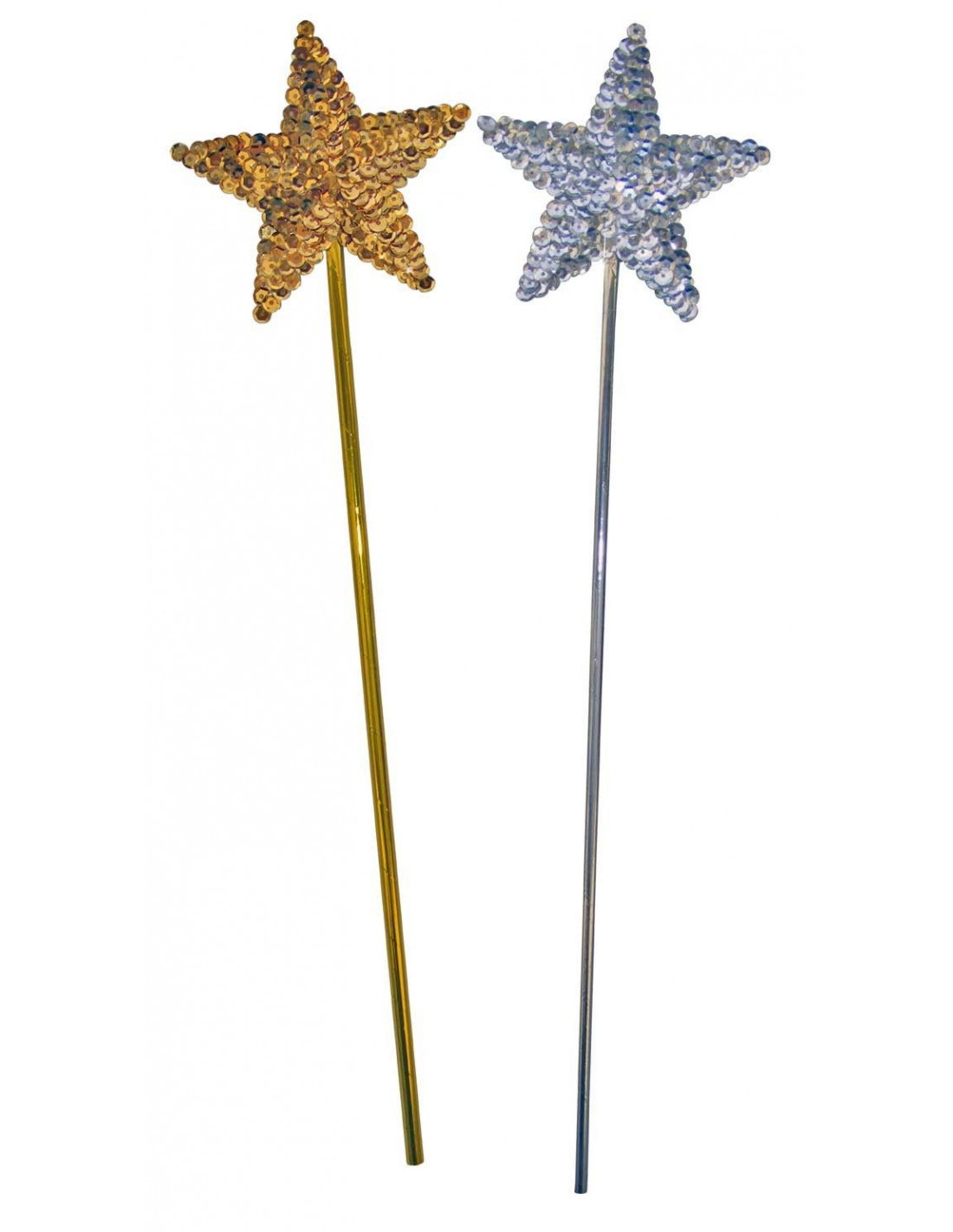 Miles de hechizos realizarás con esta varita de hada. Incluye una elegante y clásica varita de hada, fabricada en plástico de pvc forrado con una lámina brillante, y con una extrella de lentejuelas en la punta. Disponible en color plata y oro.