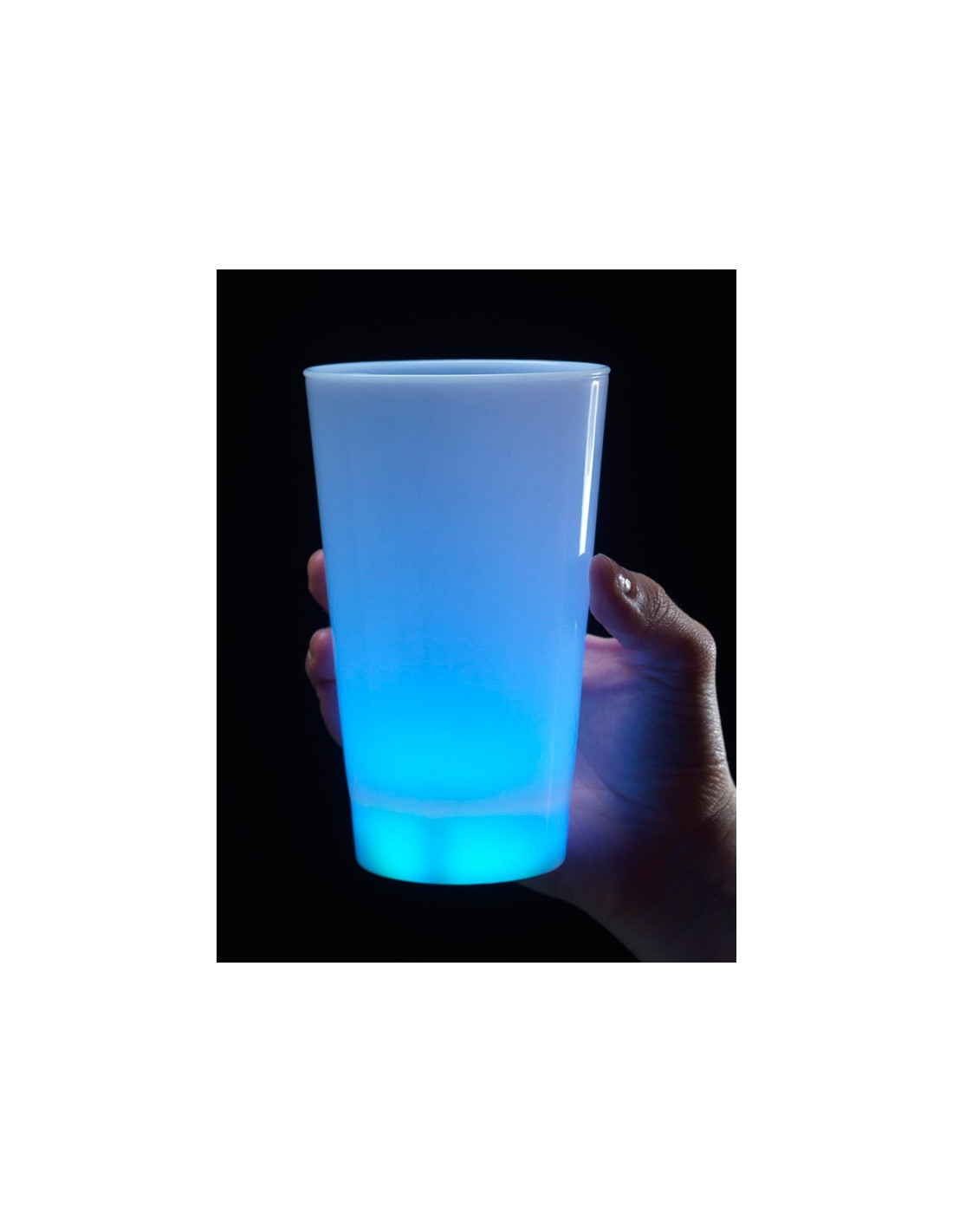 Vaso luminoso de plástico con luz en colores surtidos. Tiene una altura de 18cm. Funciona con tres pilas AG13/LR44 (1.5v), no usar pilas recargables.