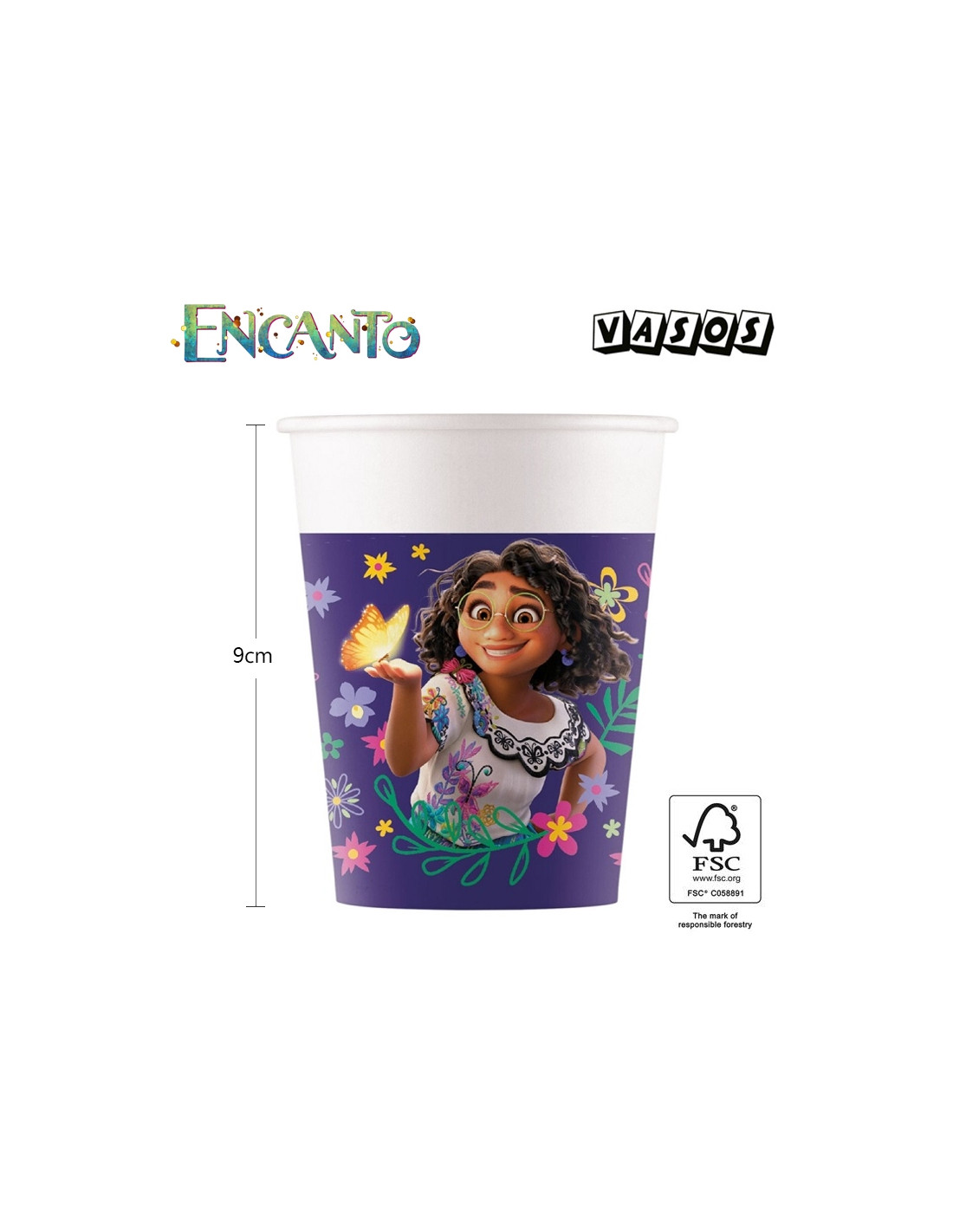 Contiene 8 Vasos Encanto con estampado de Mirabel. Están hechos de cartón, miden 9cm de alto y tienen capacidad para 20cl.