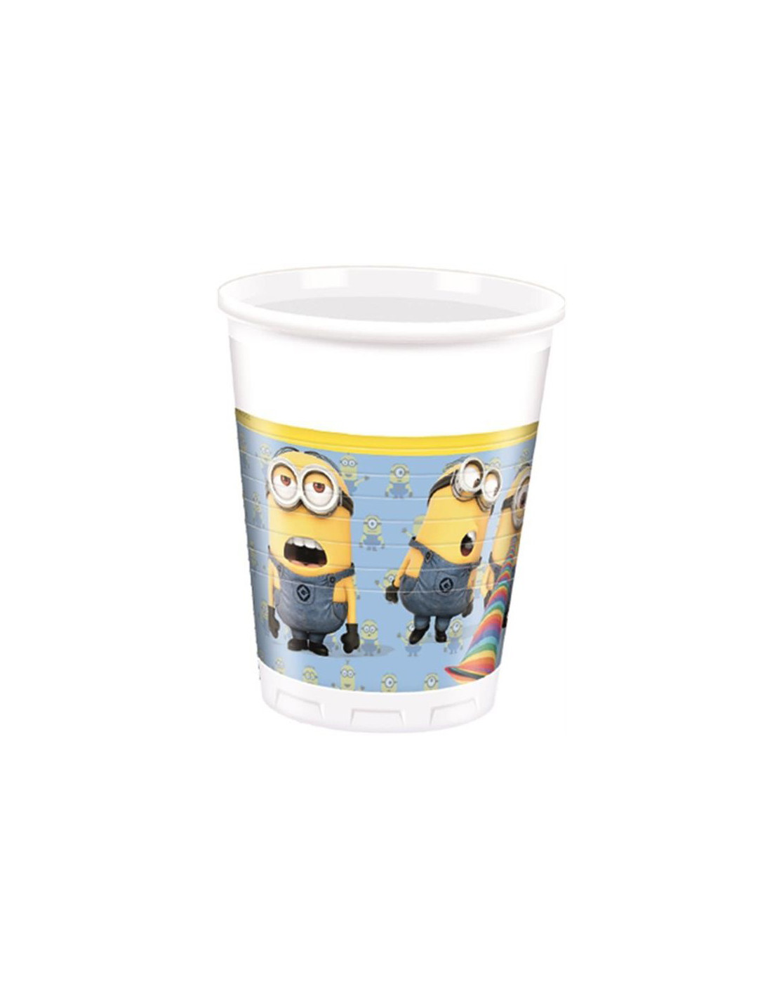 Contiene 8 vasos de plástico estampados con la imagen de los minions.