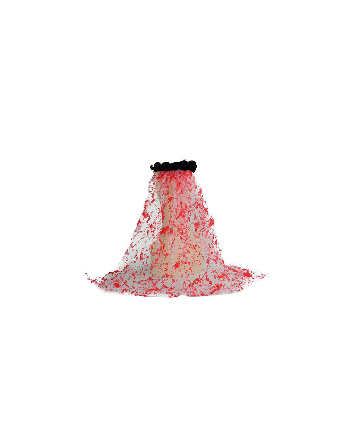Velo novia zombie que consta de una diadema forrada de raso negro, decorada con rosas negras y un velo manchado de sangre de unos 50cm de largo aproximadamente.
