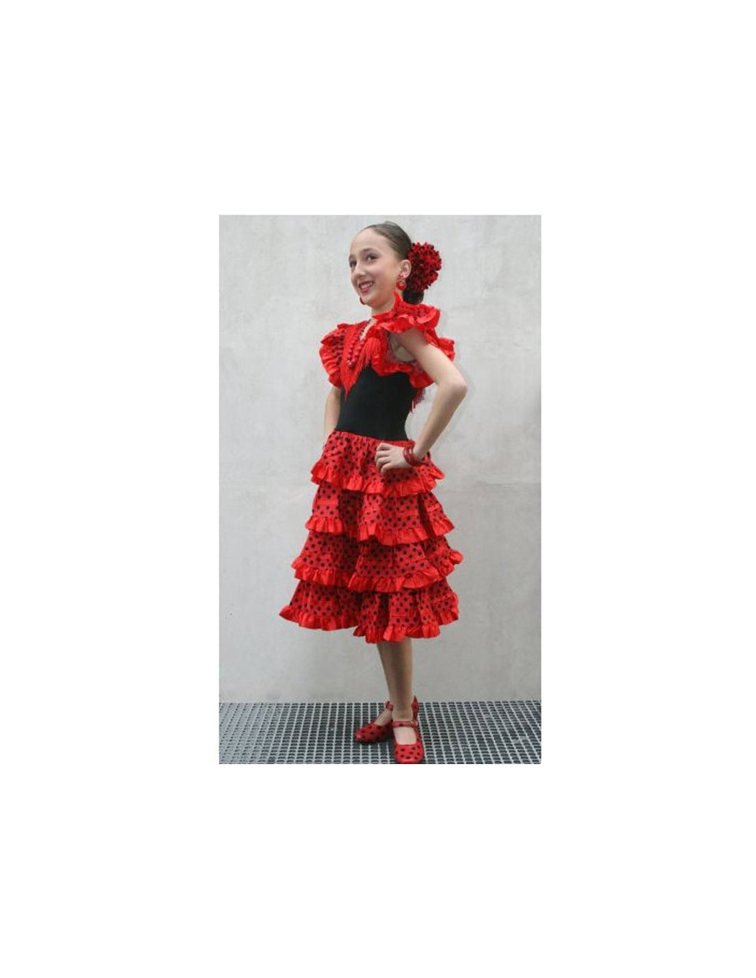 Baila al ritmo de las palmas con este vestido de andaluza de cuatro volantes. Incluye vestido andaluza infantil, con falda a media pierna.