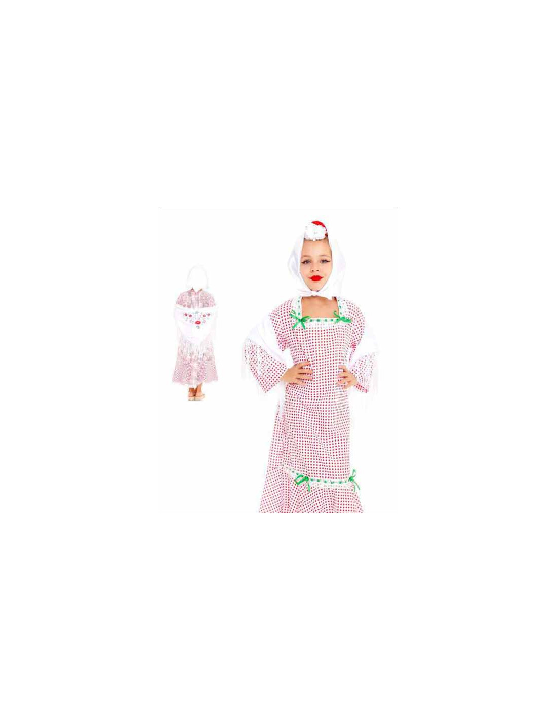 El disfraz de chulapa infantil contiene un bonito vestido con lunares en color blanco y rojo, y un pañuelo blanco a juego para la cabeza. No contiene el mantón.