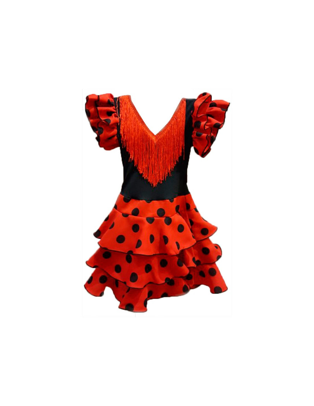Vestido de andaluza para niña que incluye un vestido con 3 volantes, escote en pico y flecos de seda para darle un acabado perfecto. La manga tiene dos volantes. Su composición es 50% Poliéster, 40% Algodón, 10% seda.