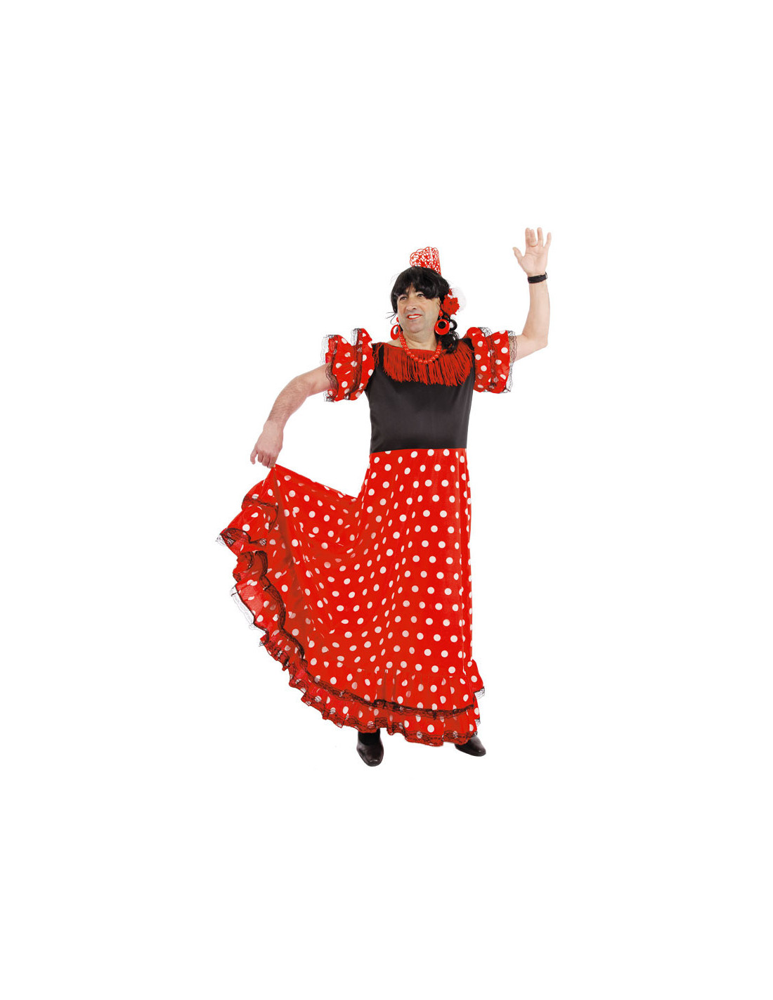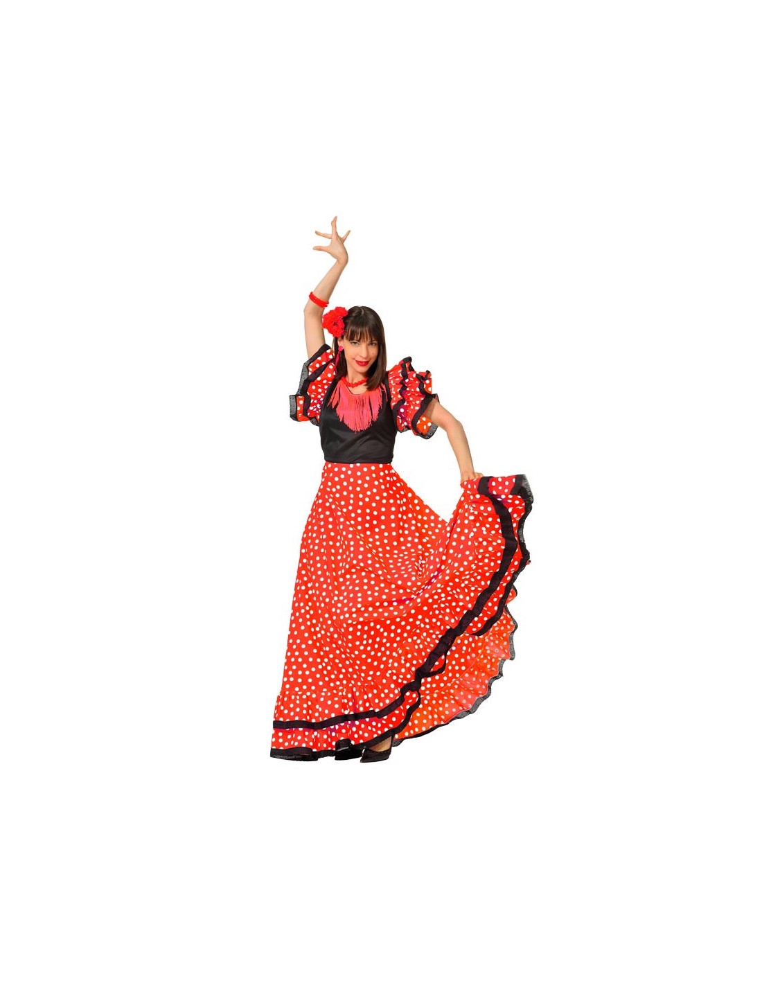 Económico y sencillo disfraz de andaluza para que bailes unas sevillanas. El traje incluye: vestido con falda roja en topos blancos y dos volantes con pasamaneria negra, cuerpo negro con fleco en el cuello y volantes en los brazos.