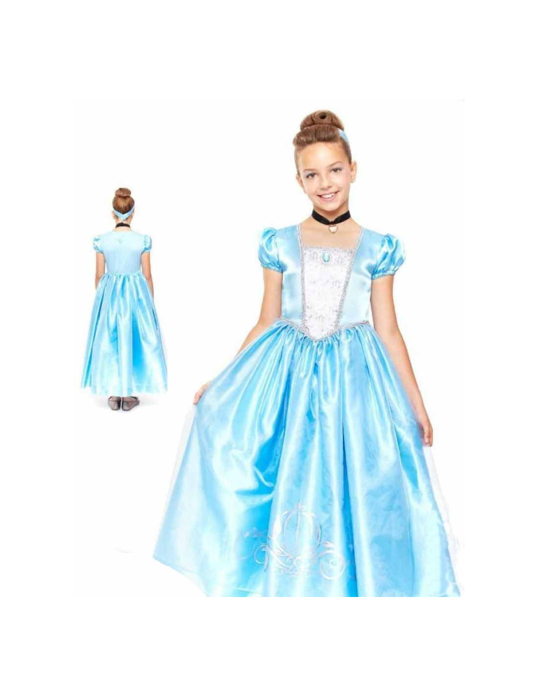 Vestido princesa Cenicienta infantil, esta compuesto por vestido de color azul, diadema y collar.
