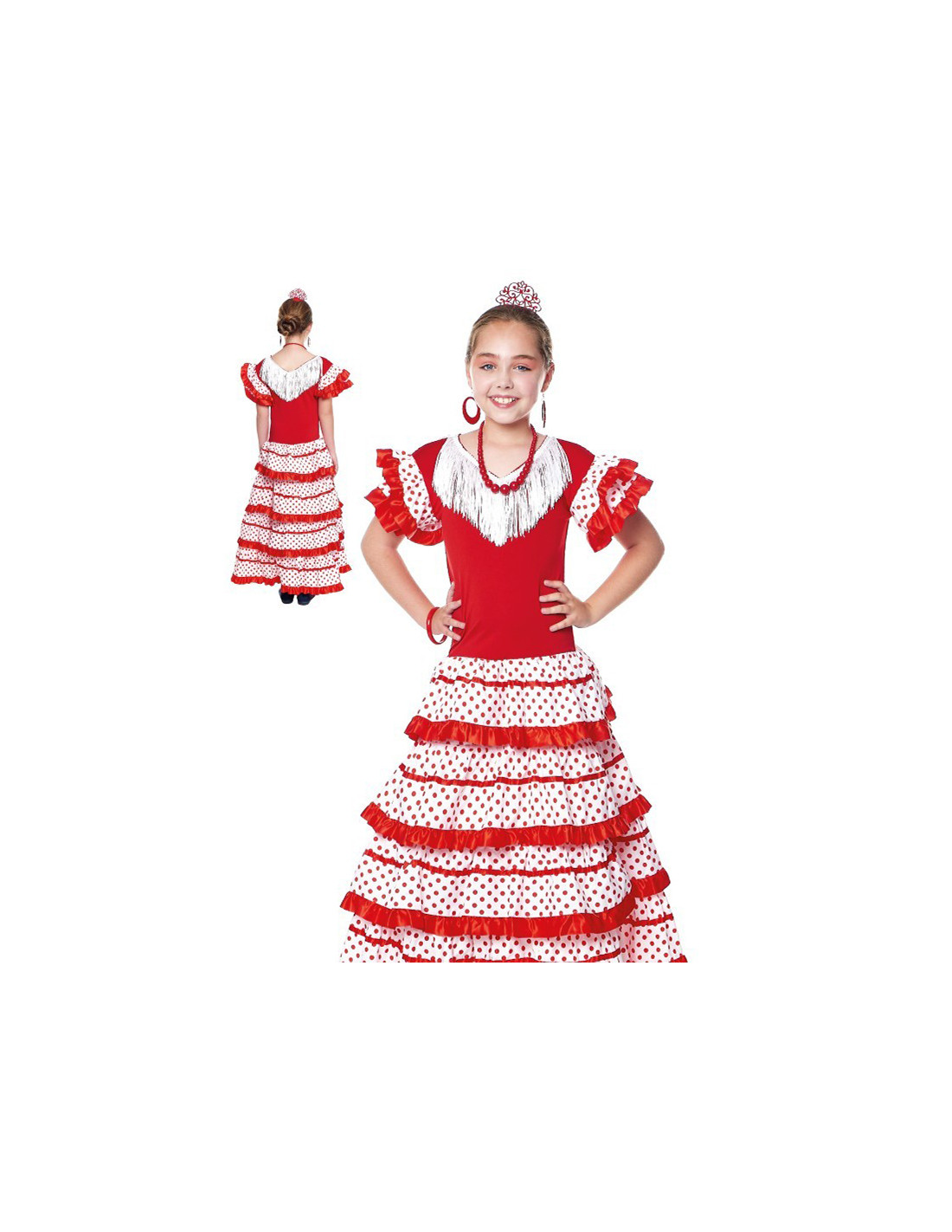 Vestido sevillana blanco para niña que incluye vestido de color rojo y blanco con cuatro volantes.