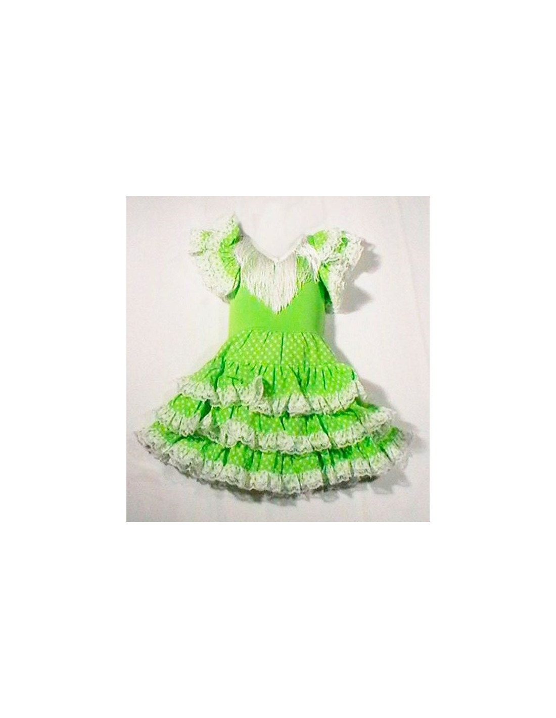 Vestido sevillana niña con 3 volantes y un acabado precioso que le da al vestido un toque diferente. Vestido de sevillana confeccionado en lycra, aportando una perfecta adaptabilidad al cuerpo y flexibilidad al movimiento. Falda con volantes y puntilla. El vestido no dispone de mangas, con un volante igual que los de la falda. El escote es en pico rematado con unos originales flecos, tanto delante como en la espalda. Cuerpo 100% Poliamida. Falda 20% Algodón y 80% Poliéster.