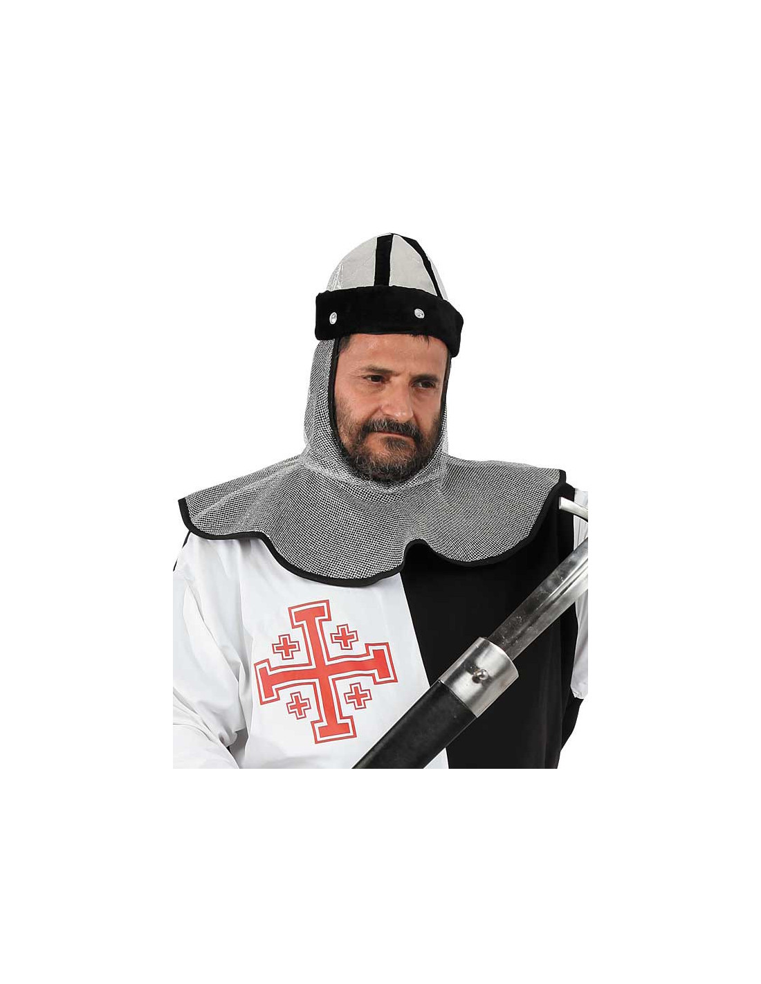 Yelmo medieval con cubrehombros, fabricado de tela y simulando el tejido de cota de malla. Tamaño para adulto.