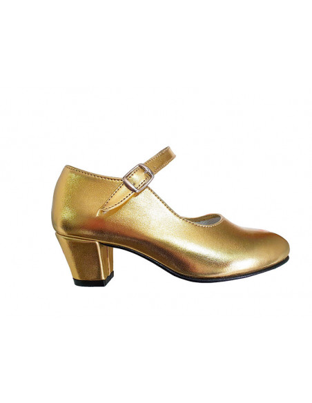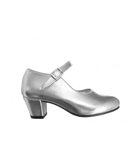 Zapato andaluza para baile flamenco, fabricados en España de piel sintética, con forro para evitar daños en la piel y se atan con hebilla para mayor sujeción. La suela es de plástico por lo que no admiten clavos. Se recomienda coger una talla más de la que usan de zapato. Este zapato está disponible en plata, oro, rojo y topo blanco.