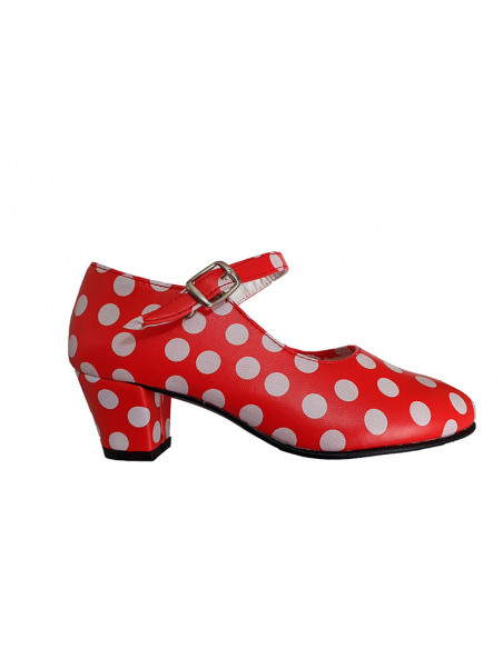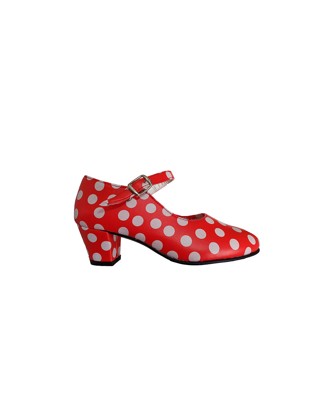Zapato andaluza de polipiel en colores oro, plata y rojo con topos blancos o negros.