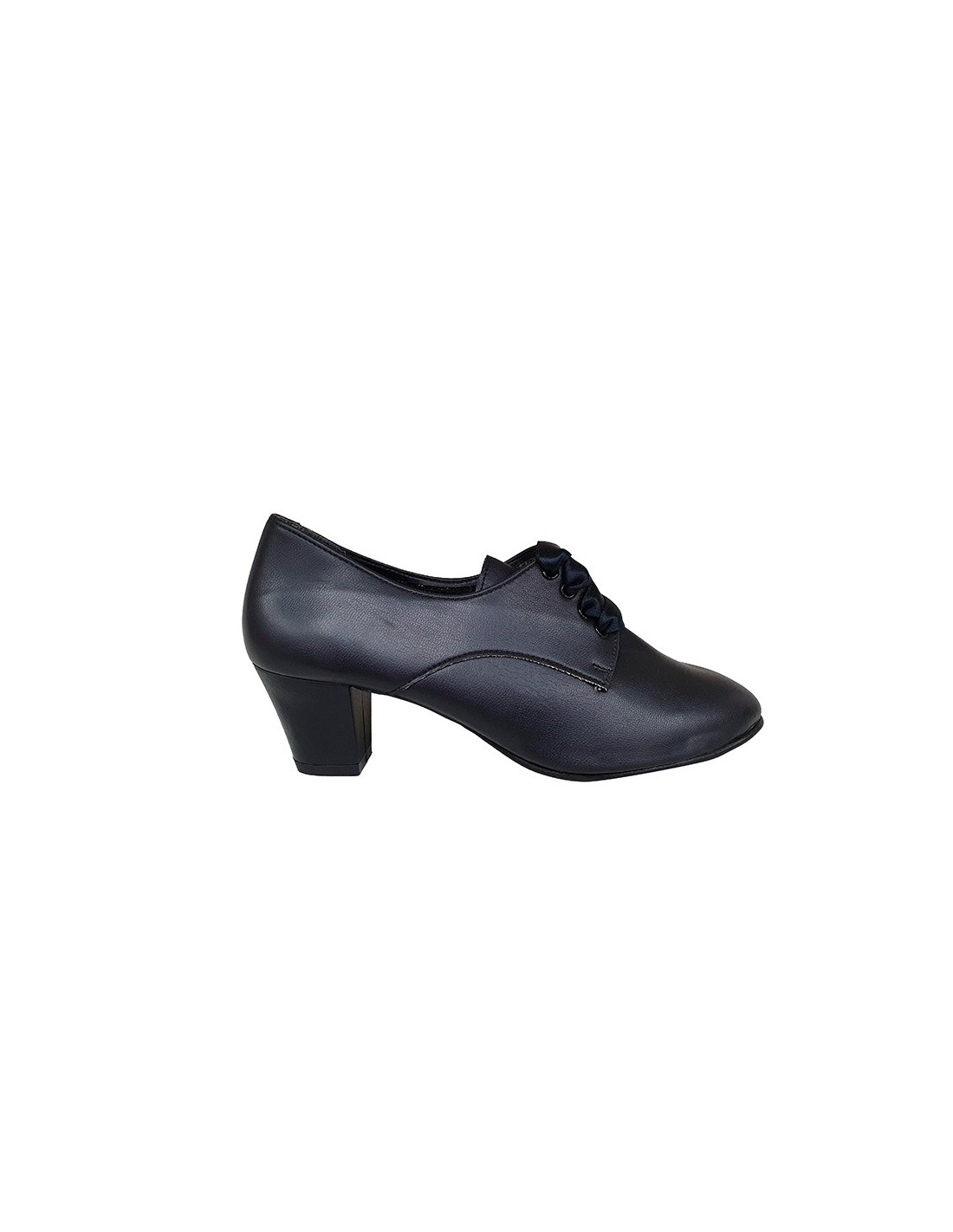 Zapato regional negro con cinta de raso negro, sintéticos y con tacón de 4cm aproximadamente.